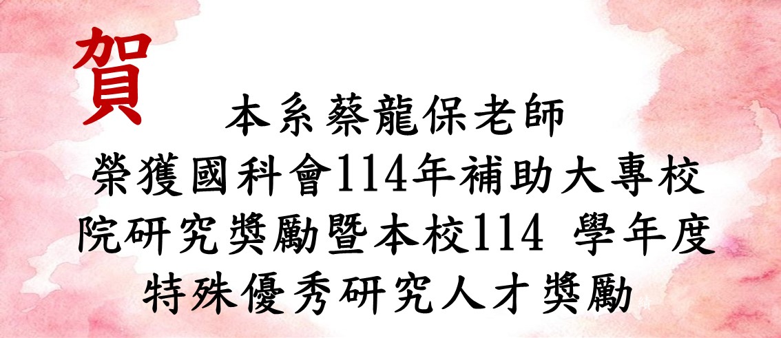 【賀】本系蔡龍保老師榮獲國科會114 年補助大專校院研究獎勵暨本校 114 學年度特殊優秀研究人才獎勵